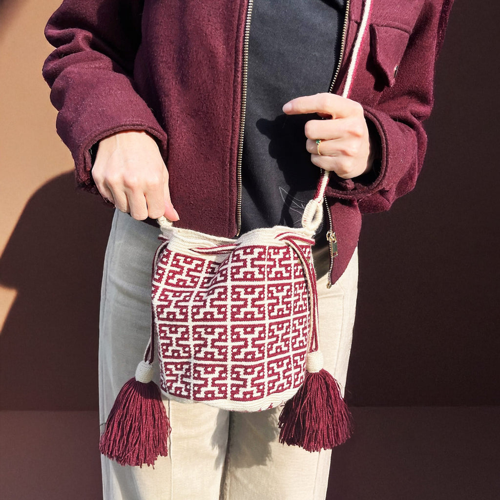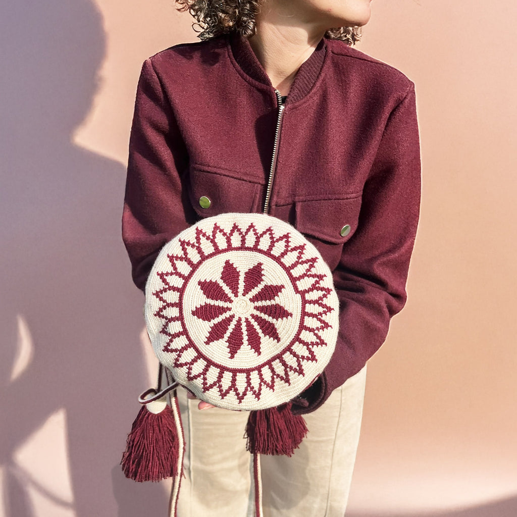 Voici une mochila Wayuu fabriquée par une tisserande du peuple des Wayuus. Ce sac est crocheté à la main avec une technique ancestrale transmise de mère en fille et de génération en génération. Il faudra pas moins de 21 heures de travail pour que cette mochila prenne vie.